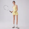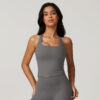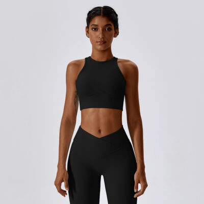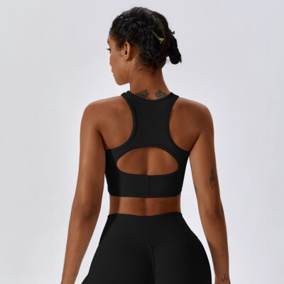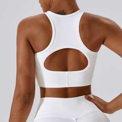 The Florence Bra Top in ribbed fabric, features a high neckline, mid-length and hollow racer back design, can be paired with almost any bottom piece for a clean & modern look!