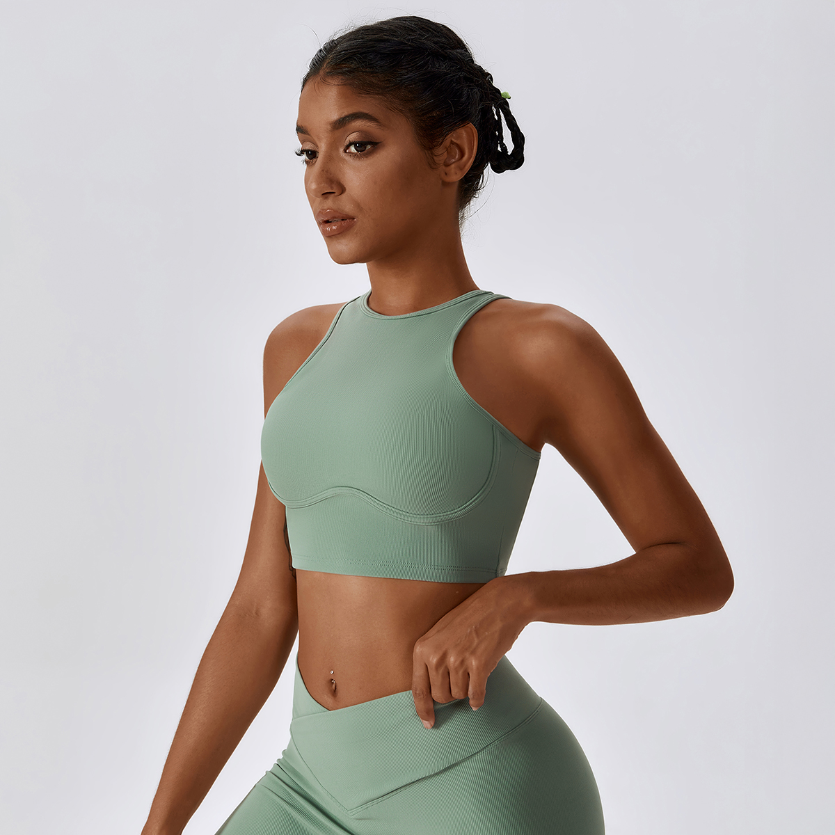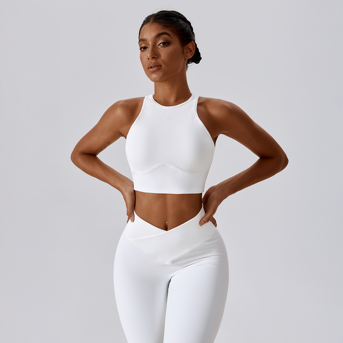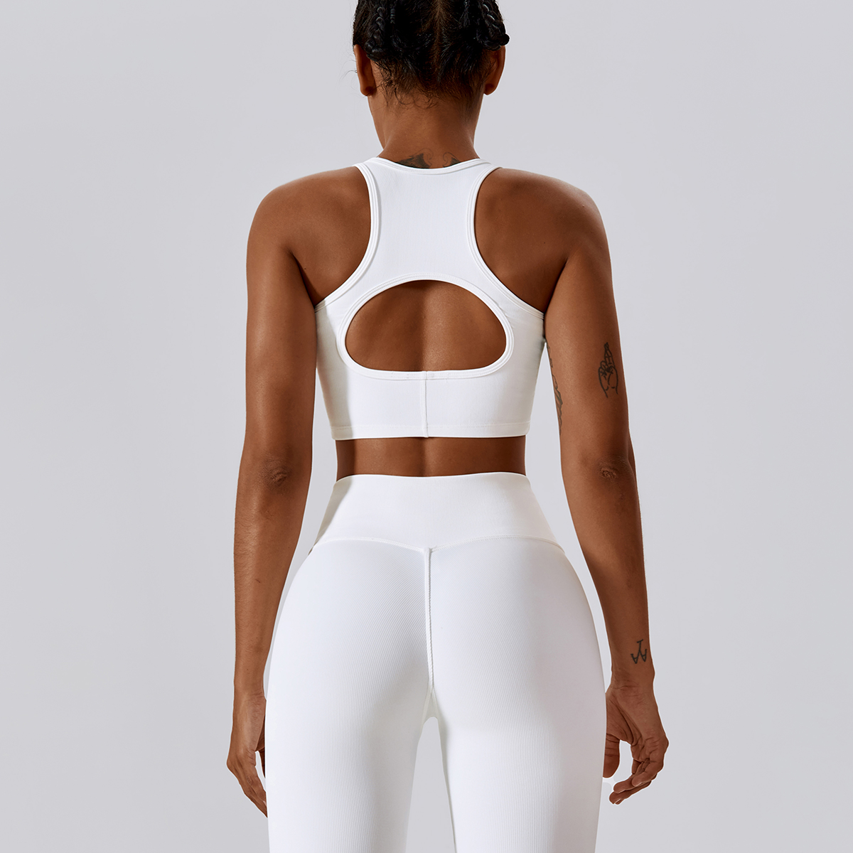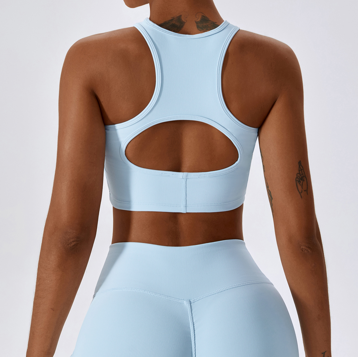 The Florence Bra Top in ribbed fabric, features a high neckline, mid-length and hollow racer back design, can be paired with almost any bottom piece for a clean & modern look!