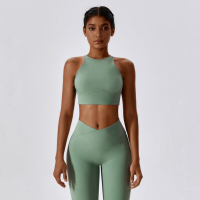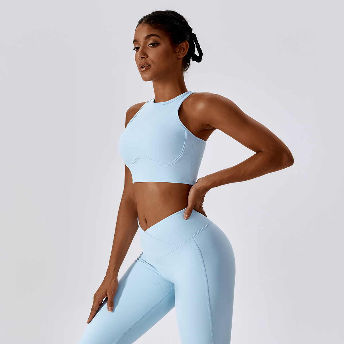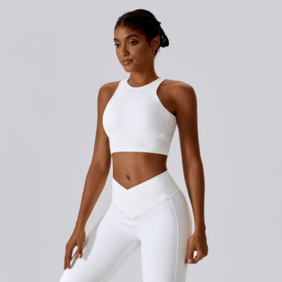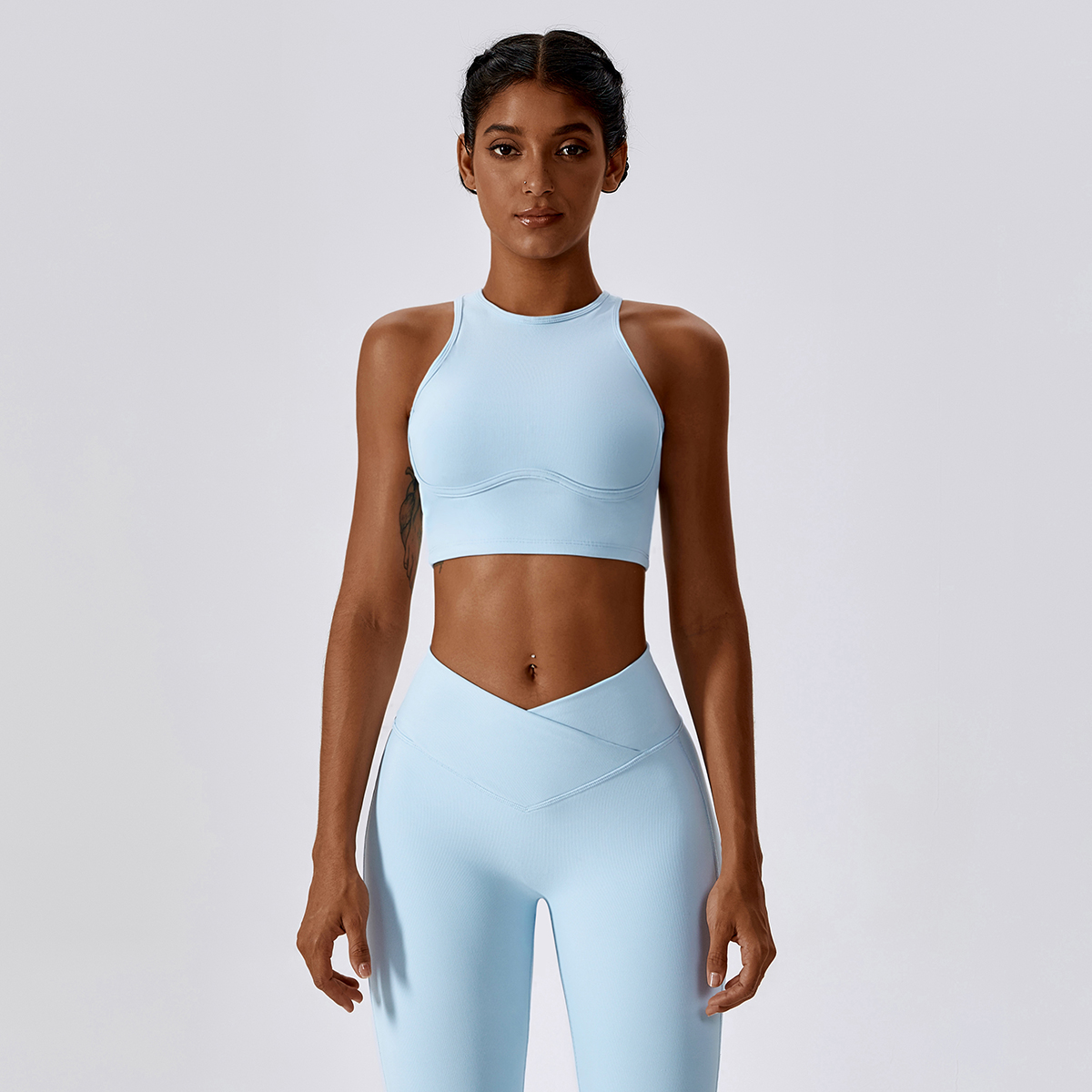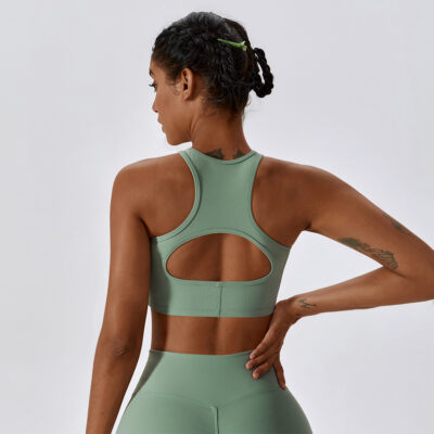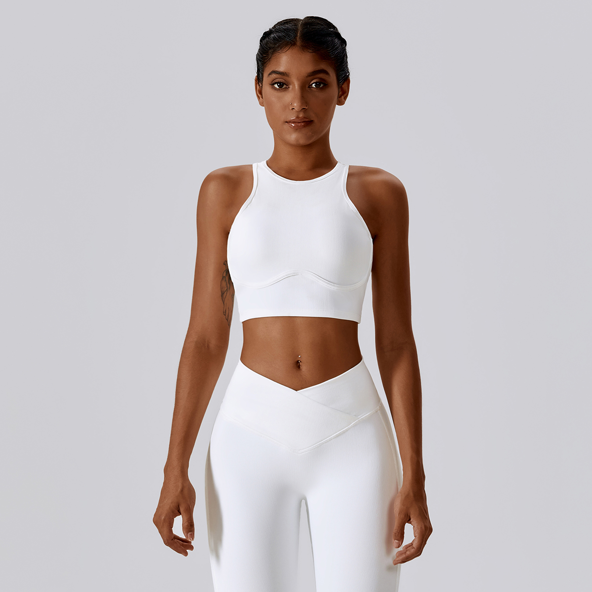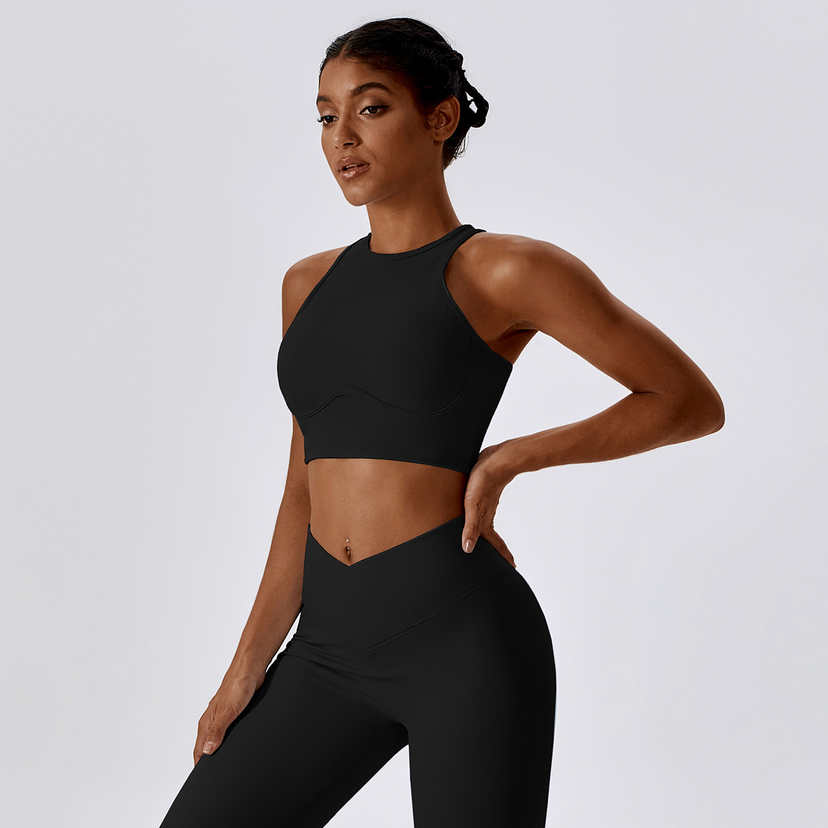 The Florence Bra Top in ribbed fabric, features a high neckline, mid-length and hollow racer back design, can be paired with almost any bottom piece for a clean & modern look!