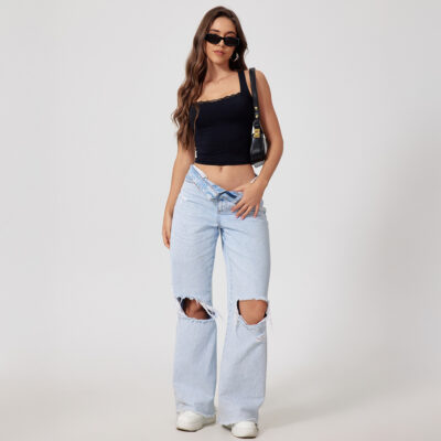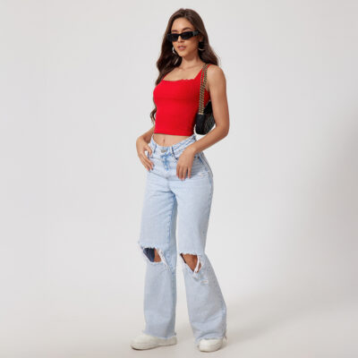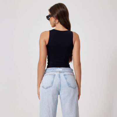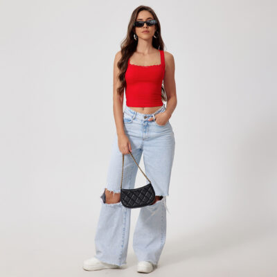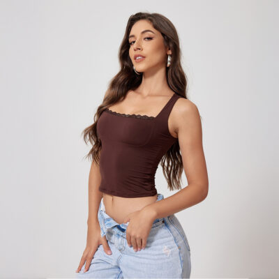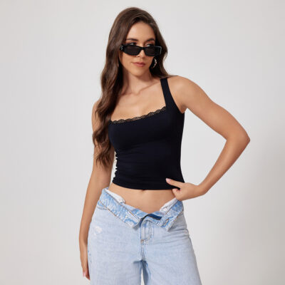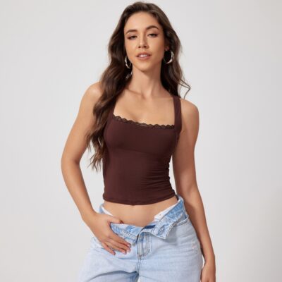The Lace Trimmed Tank Top is a stylish and versatile piece featuring a form-fitting silhouette, complemented by delicate lace trim along the neckline for a touch of feminine flair.