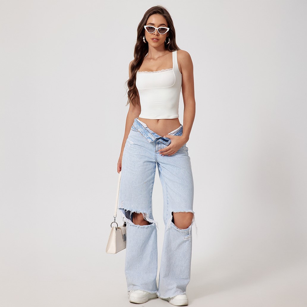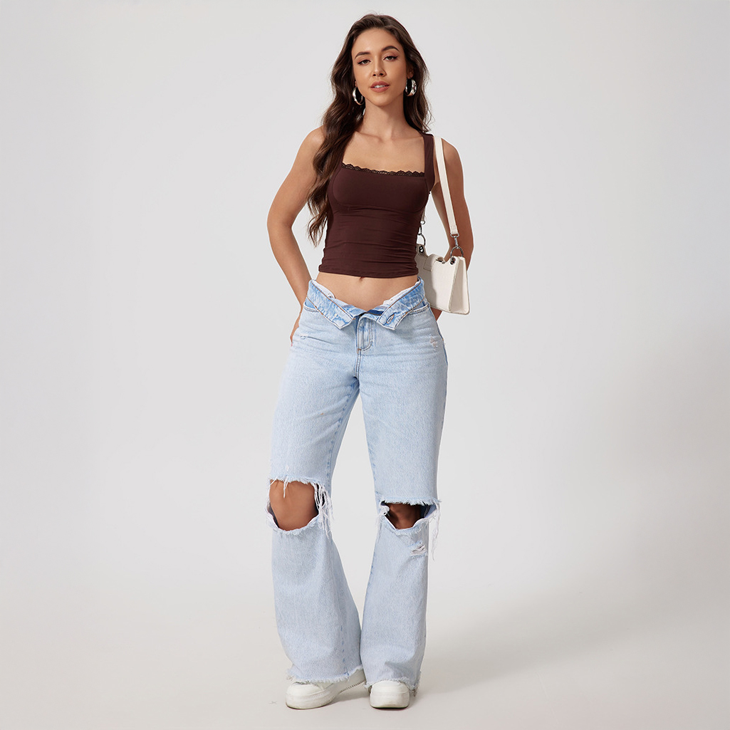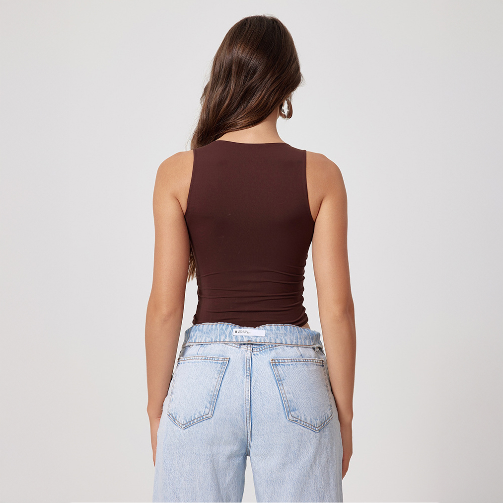 The Lace Trimmed Tank Top is a stylish and versatile piece featuring a form-fitting silhouette, complemented by delicate lace trim along the neckline for a touch of feminine flair.