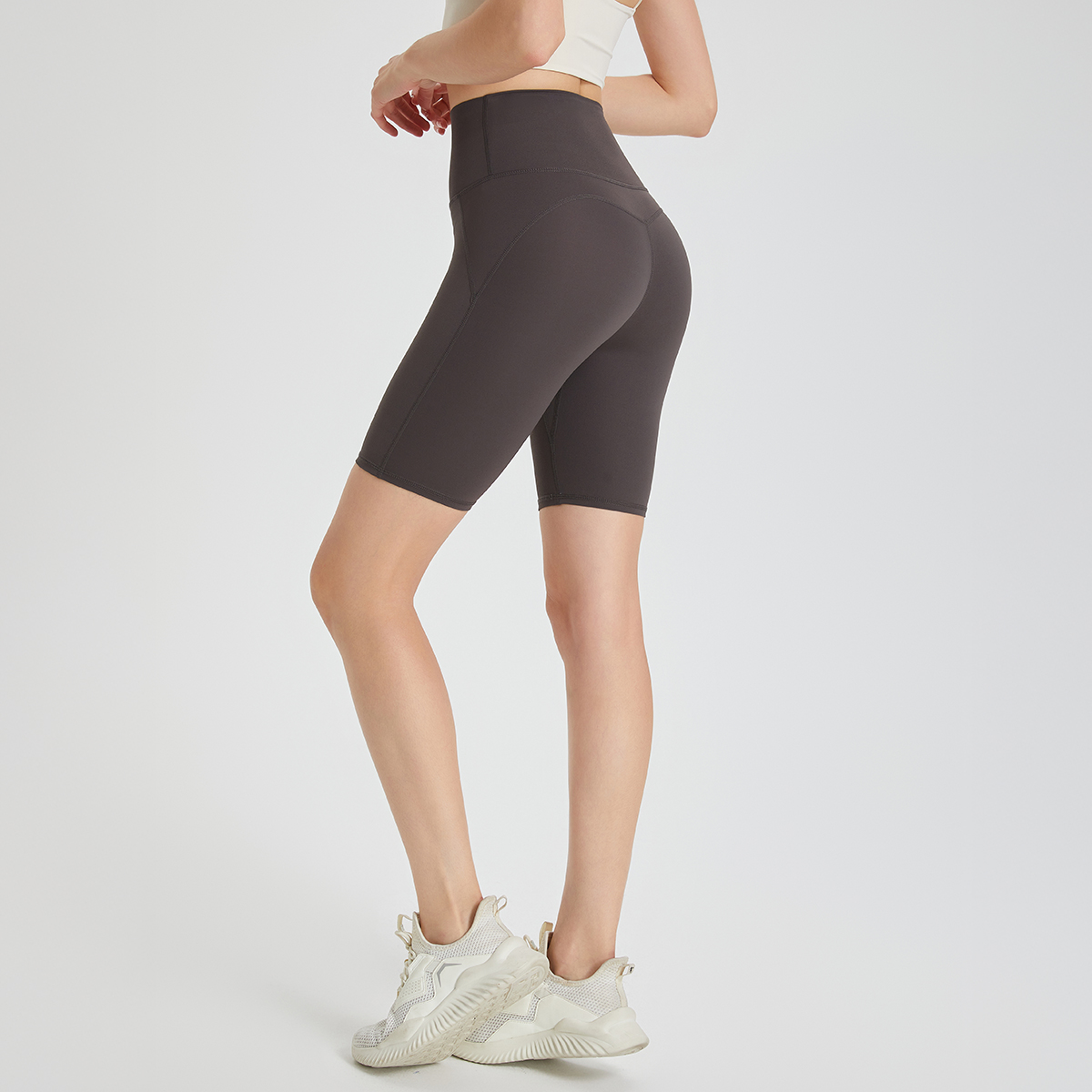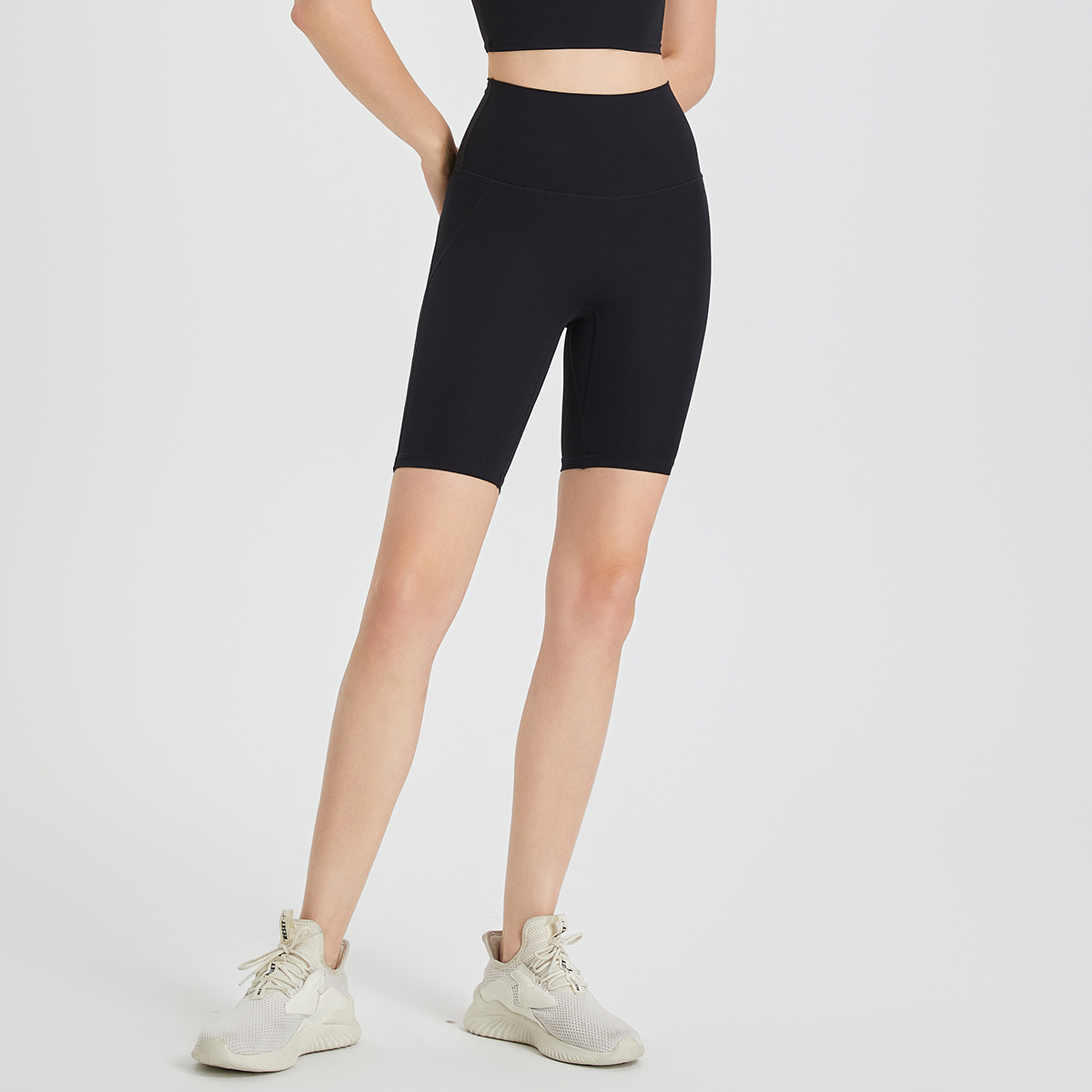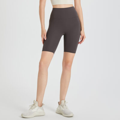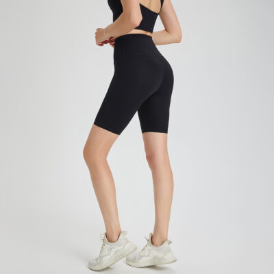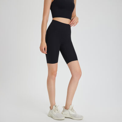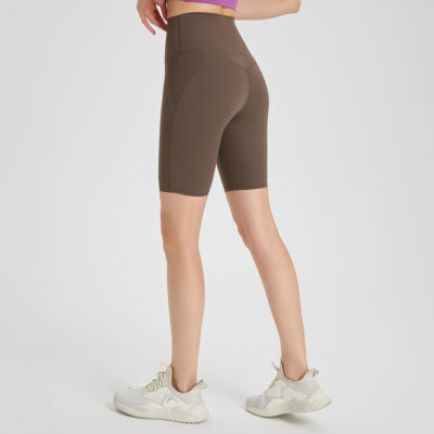 - High-waisted, quarter-length, form-fitting sports shorts for higher coverage