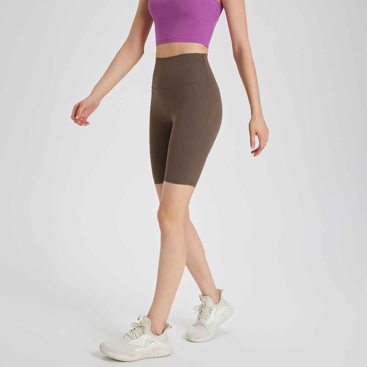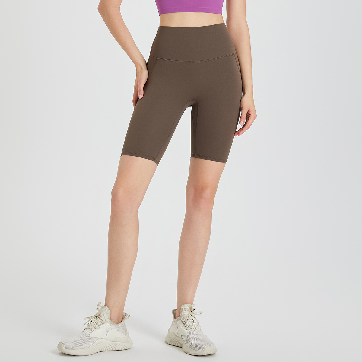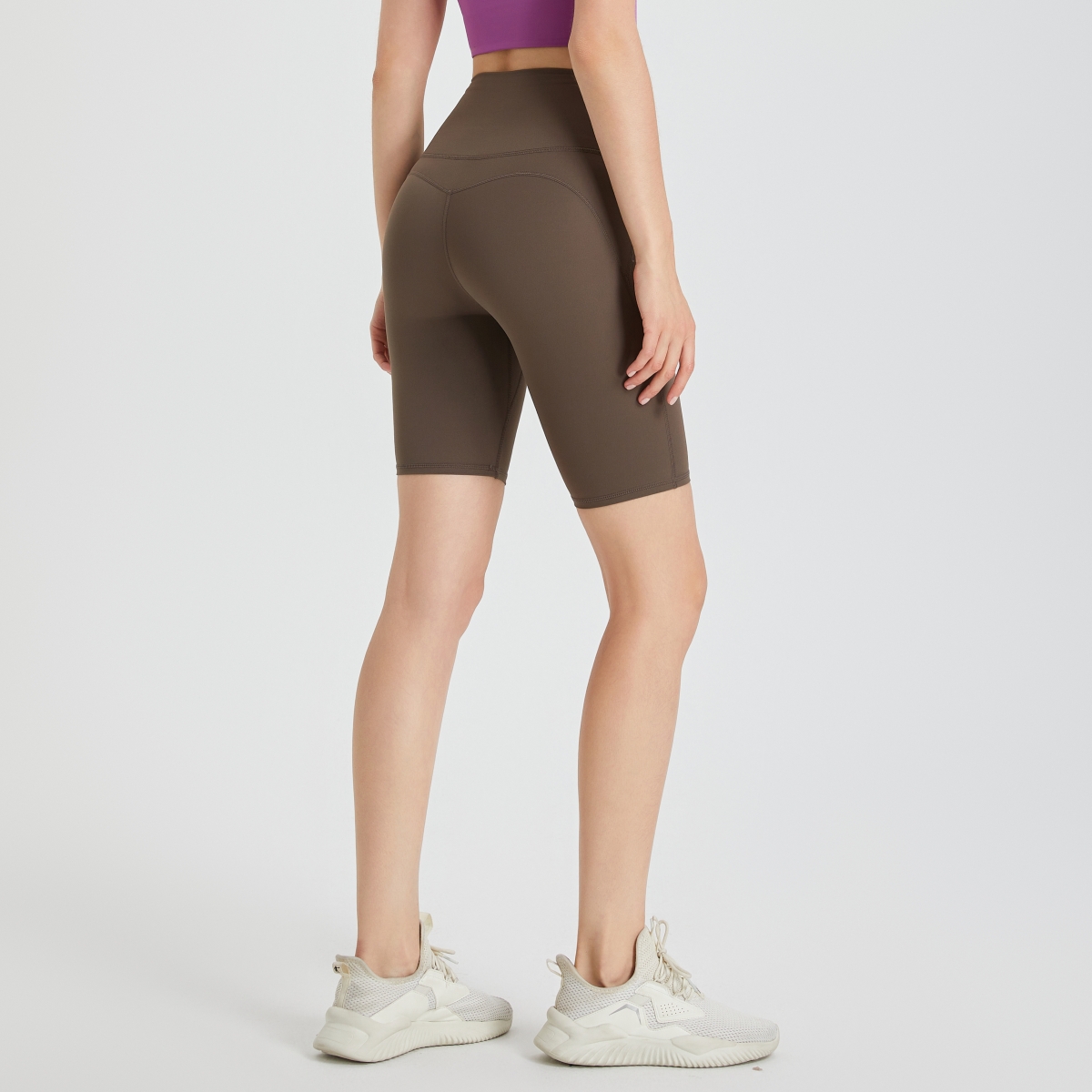- High-waisted, quarter-length, form-fitting sports shorts for higher coverage